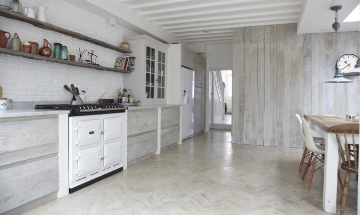- Отличителен белег на селското страна е използването на естествени материали, особено дърво. Много често дизайнерите, когато декорират тавана, оставят дървени греди отворени. Стена, облицована с изкуствено състарен ламинат, ще помогне за визуално поддържане на такива тавани..