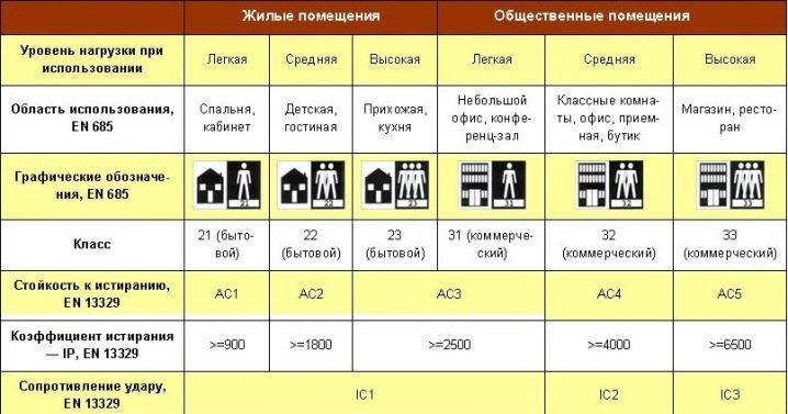 За класификацията на ламината се използват европейски маркировки. Тя се основава на тестове за устойчивост на влага, абразия, здравина и звукопоглъщане. В резултат на всички тестове бяха идентифицирани два основни класа: за търговска употреба (31-34) и за битова употреба (21-23).