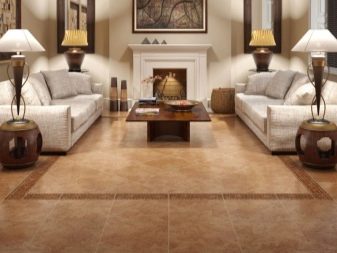 Понякога за декориране на хол се избира керамично покритие. Такъв под може да изглежда стилен и интересен. Например, модели могат да бъдат изложени от светли плочки, за да се разнообрази едноцветното довършително платно на пода. Използвайки плочки с различни нюанси, можете да разделите голяма всекидневна на няколко зони (например можете да използвате няколко пастелни цвята).