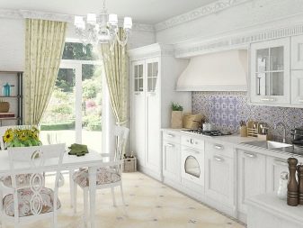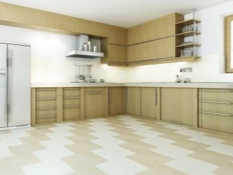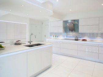 Подовите светли плочки са идеални за кухнята. В този случай си струва да се обмислят матови и лъскави опции. Леката и лъскава текстура на плочките ще направи кухнята визуално просторна и стилна. В същото време сортовете с контрастни вложки, например под формата на килим, ще изглеждат особено интересни. Така че можете да победите областите с по -голям трафик.