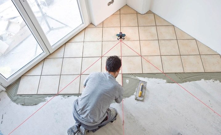 - С помощта на въже трябва да маркирате диагонал от ъгъл до ъгъл или да начертаете линия с тебешир. Трябва да започнете работа от ъгъла с диагонално изрязана плочка..