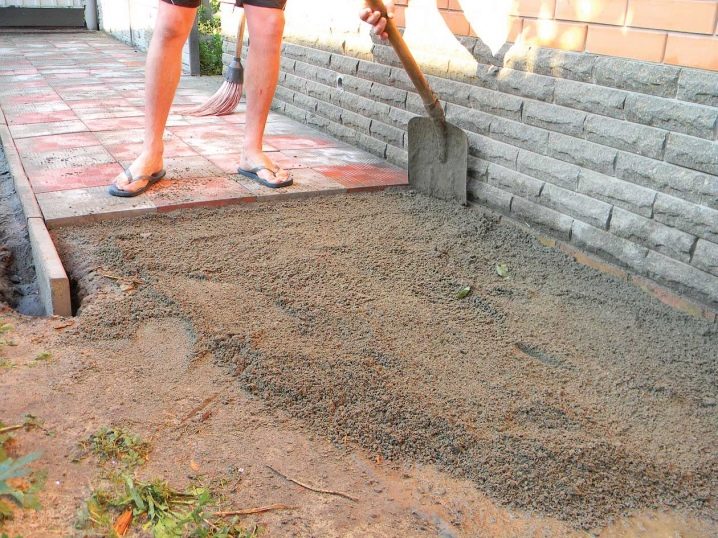 - За пясъчно-циментова смес, която се състои от пясък и цимент в съотношение 3: 1 (в случай на цимент клас М300). Като цяло, колкото по -висок е класът, толкова повече парчета пясък трябва да добавите. Тя трябва да е леко влажна. Най -доброто време за работа е пролетта и началото на лятото. Циментът се втвърдява след поливане на покритието, като по този начин го фиксира сигурно.