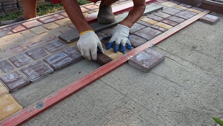 Когато основата е готова, можете да монтирате плочките. Правилно е да започнете от долната точка и да се придвижите нагоре, като използвате метода от себе си. По този начин паветата се придвижват по вече положената повърхност, за да не се повреди основата. Трябва постоянно да имате ниво под ръка, за да отстраните нередностите навреме. Всеки елемент се инсталира според избрания модел и се потупва с гумен чук, за да се потопи частта в земята и да се фиксира в желаното положение.