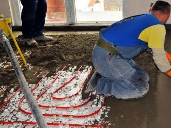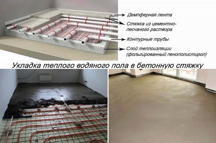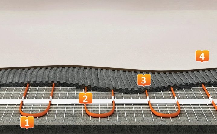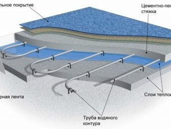 Системите за отопление на водата винаги са многослойни. Основата е направена водоустойчива, след това влиза топлоизолация (не позволява на топлината да слезе). След това вече се поставят тръби с малък диаметър, покрити с носещ слой – бетонна замазка, от време на време с гипсови влакна. И едва тогава идва ред на действителната настилка. Видът на припокриването определя дебелината на цялата конструкция., варира от 5 до 15 сантиметра.