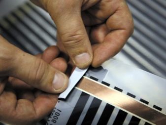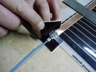 Единият край на контактната скоба се вкарва в кухината, отделяща филмите от сребърните ленти, другият е прикрепен към медната основа и се притиска с клещи. Придвижвайки се последователно, всички контакти се обработват по този начин. Не забравяйте да изолирате точките на свързване! Температурният сензор трябва да бъде прикрепен към долната страна на черната лента, поддържан от битумна изолация. не забравяйте, че термичните ленти трябва да са на поне 10-50 сантиметра от отоплителните устройства, в зависимост от отоплителната мощност.
