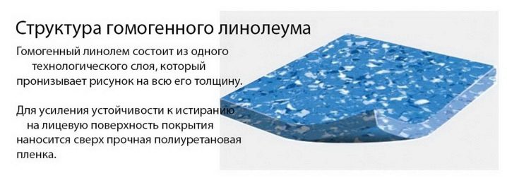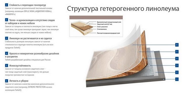 Хетерогенната версия е многослойна – фибростъклото, използвано при производството му, придава допълнителна здравина, върху фибростъкло се нанася PVC покритие, върху което се отпечатват различни шарки или шарки. И накрая, последният слой е прозрачен филм (полиуретан), който изпълнява защитни функции. Дебелината на хетерогенен линолеум може да бъде до 7 милиметра.