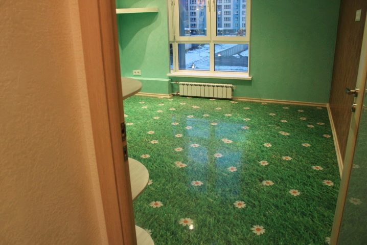 - Украса за детска градина психолозите препоръчват да се изпълняват в спокойни, приглушени тонове, тъй като психиката на детето е лесно възбудима. За това са подходящи екологично чисти линолеуми с функция против приплъзване (за по-голяма безопасност на децата), с модел като естествено дърво или просто обикновен, например, теракотен нюанс. Но в банята можете да поставите 3D покритие с изображение на вода и златни рибки..