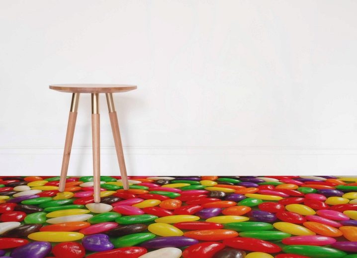 - За оригиналния дизайн на пода в сладкарницата подходяща е настилка под формата на шоколадова лента, а по краищата (по стените) можете да поставите линолеум със златни цветове (на теория би трябвало да се окаже нещо като разопакована шоколадова лента – за по -апетитна и реалност струва си да похарчите пари за 3D версията). Или можете да извършите монтаж с линолеумни плочки с различни шарки – горски плодове, торти, гуми и други сладкиши. Основното е да съставите композицията правилно, така че да не е твърде ярка, многоцветна и остра и да не уморява очите на персонала, работещ в предприятието..