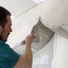 - За стръмен свод се използва методът на огъване на “мокър” лист.. Направете шаблон от плътен картон. Ивица от гипсокартон се изрязва с необходимия размер и се навива с иглена ролка. Навлажнете от едната страна, като се опитвате да го направите равномерно, като не позволявате задната страна да се намокри. Навлажненият лист се поставя върху шаблона и леко се огъва, като се опитва да не счупи сухата страна на гипсокартона. Огъването се извършва от центъра към ръбовете, като се достигне желания радиус, лентата се фиксира с импровизиран материал, пръти или по друг начин. След пълно изсушаване завийте върху рамката.