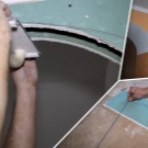 - За стръмен свод се използва методът на огъване на “мокър” лист.. Направете шаблон от плътен картон. Ивица от гипсокартон се изрязва с необходимия размер и се навива с иглена ролка. Навлажнете от едната страна, като се опитвате да го направите равномерно, като не позволявате задната страна да се намокри. Навлажненият лист се поставя върху шаблона и леко се огъва, като се опитва да не счупи сухата страна на гипсокартона. Огъването се извършва от центъра към ръбовете, като се достигне желания радиус, лентата се фиксира с импровизиран материал, пръти или по друг начин. След пълно изсушаване завийте върху рамката.