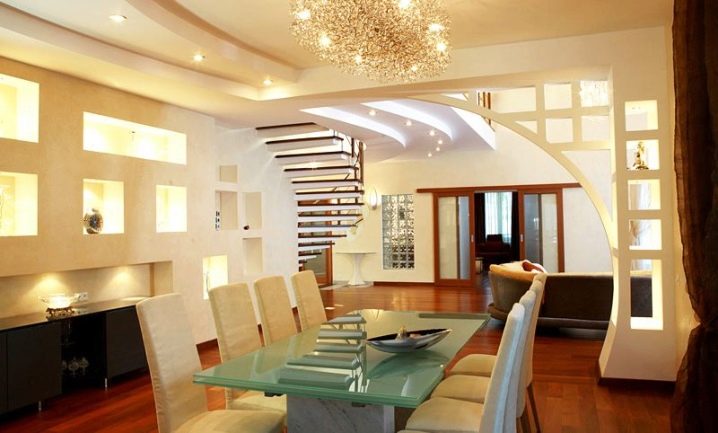 Гъвкавият гипсокартон успешно се използва за създаване на извити форми на окачени тавани. Ниши с осветление от гипсокартон ще добавят изразителност към стаята. Стилът на 60 -те години на ХХ век с прости лаконични форми ще бъде допълнен от радиална арка с LED лампи. Същите полукръгли форми на таван на две нива ще направят стаята по-висока и по-просторна..