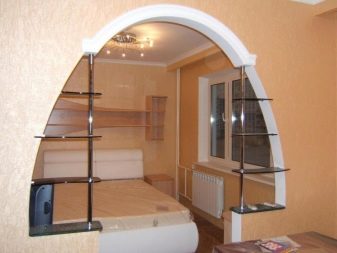 Аркообразният свод, украсен с рафтове за книги, подчертава функционалното значение на изследваната зона и създава допълнително място за съхранение. Отварянето на рафтовете трябва да бъде украсено с предмети, които не създават усещане за претрупване. За да направите това, те се подбират според цвета и външните характеристики, подходящи за даден интериор..