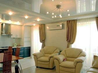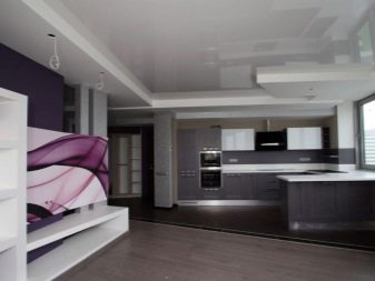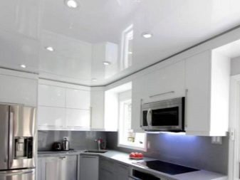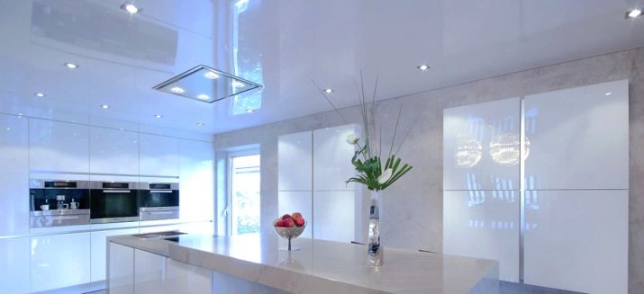 В кухнята лъскавият PVC таван, в допълнение към устойчивостта на влага, ще бъде подходящ поради факта, че не е импрегниран с миризми и е лесен за почистване, но газовата печка трябва да бъде оборудвана с добра абсорбатор, в противен случай нейната топлината може да разруши покритието. В допълнение, прахът практически не се придържа към лъскавия таван..