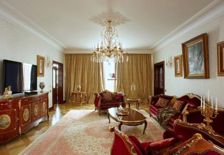 Интериорът, изпълнен в класически стил, успешно се допълва от бял опънат таван с матова текстура, подчертаващ измерението и солидността, характерни за класиката. Но лъскава повърхност с отблясъци и отражения ще бъде неподходяща тук..