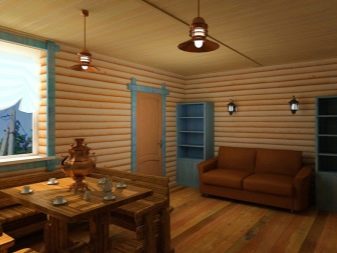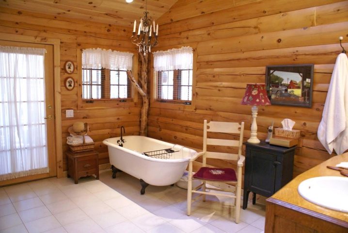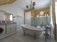 Може ли блок къща да се използва в баня? На пръв поглед идеята изглежда доста необичайна, но защо не. Материалът се използва активно за облицовка на бани и сауни, така че няма да е трудно да изберете сорт, който не се страхува от висока влажност. След това остава само да извършите необходимата работа, като завършите облицовката на стените и тавана. Можете да допълвате такъв интериор с необичайни аксесоари, като използвате ретро лампи с абажури и дървени шкафове. Интересен акцент ще бъде истински ствол на дърво в ъгъла с стърчащи клони, на който можете да закачите кърпи за удобство..