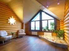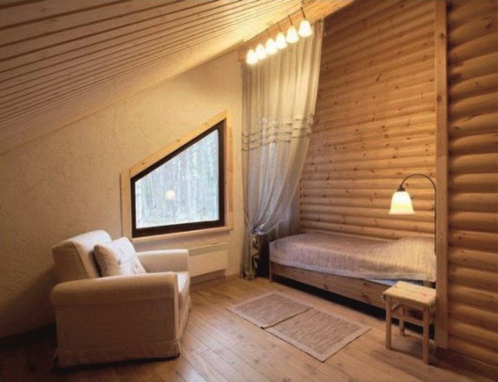 Таванското помещение с дървени облицовки изглежда много уютно. За да го направите по -интересен и оригинален, можете да използвате различни видове материали. Обшийте една от стените с блок къща и оставете дъска на тавана – имитация на бар. Другата стена може да бъде покрита с бяла или бежова боя или мазилка. Дървеният паркет също ще изглежда добре в такъв интериор..