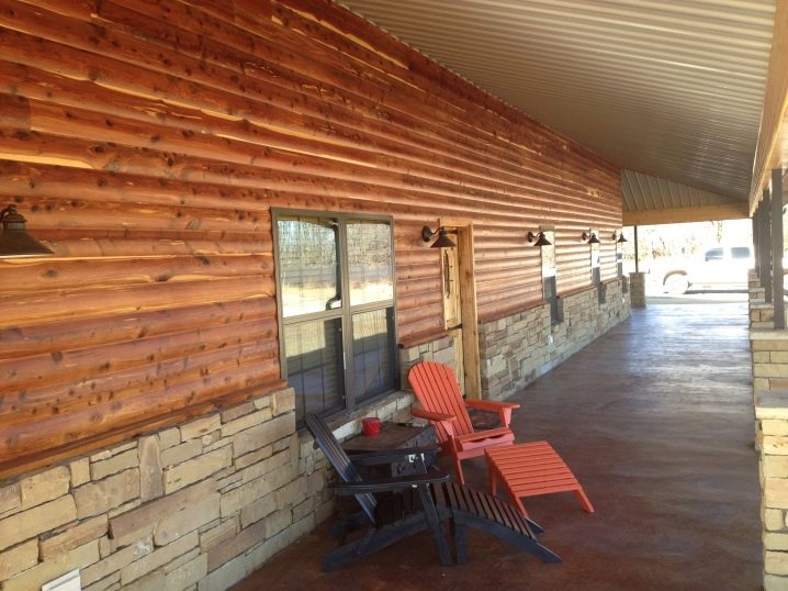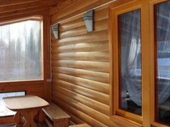 На лятната тераса стена, обшита с блокова къща, ще изглежда красиво. Дървото се съчетава добре с естествен камък, от който са направени долната половина и противоположната стена. В допълнение, под навеса, обвивката ще бъде защитена от лошо време и ще продължи по -дълго..