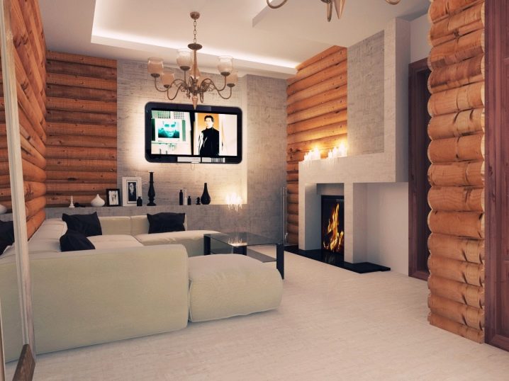 Блок блок в интериора не винаги е обстановка, която прилича на стара къща от дърво в село. Всичко може да изглежда доста модерно и стилно, ако изберете правилно други компоненти на дизайна. В тази стая бели и сиви повърхности без никакъв декор допълват оптимално дървото, подчертавайки неговата красота и текстура, така че стаята не изглежда претоварена или твърде цветна. Спокойните цветове са добри за релаксация. Мебелите продължават общата линия на минимализъм и сдържаност. Уют се добавя от електронна камина (това е съвсем в духа на модерния стил), която е комбинирана с дървени облицовки и в същото време е напълно безопасна: панелите няма да светят от случайна искра.