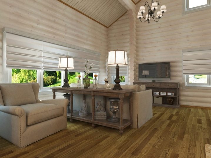 Ако стените и таванът, обвити с дърво, изглеждат твърде скучни, тогава можете да разнообразите ситуацията, като използвате различни техники. При довършването комбинирайте дървен материал с различна ширина: тесен и широк, блок хаус и имитация на бар. Играта на контрастите ще добави своеобразен акцент – присъствието на светли и тъмни тонове в обстановката. В този случай контрастът се постига не само поради светлината, но и поради местоположението: тъмните дъски преминават през обвивката, сякаш подчертават отделни части от стаята. Тази техника може да се използва и за зониране, ако има нужда да се раздели голяма обща стая на отделни ъгли за почивка, работа и хранене. Дървени рамки за прозорци и врата перфектно ще допълнят интериора, както и мебели от подобен материал..