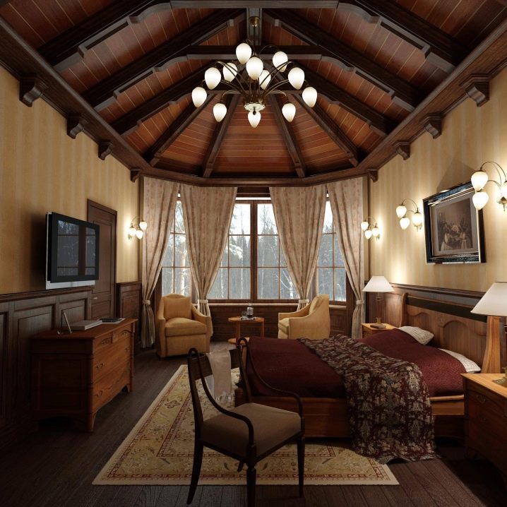 Не е необходимо да подрязвате стените с панели – можете да направите оригинален таван, който изглежда наистина необичаен. Това решение е подходящо за селска къща, където е възможно да се създаде индивидуално оформление. Общият стил на интериора може да се припише на английския селски стил. Той запазва чертите на викторианската епоха: масивни мебели, скринове вместо шкафове, използване на дървени стенни панели и тапети. В същото време има елементи, напомнящи едновременно за ловна хижа: това е структура от греди под тавана и дървена ламперия, много дърво в интериора и опростена обстановка..