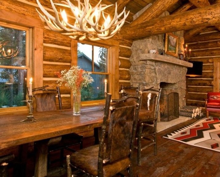 Блок къщата ще се впише идеално в атмосферата на обща стая в частна къща, която съчетава функциите на трапезария и хол. С негова помощ можете да пресъздадете интериора на дървена хижа, допълвайки картината с масивни греди под тавана, дървени мебели и дограма. Голяма каменна камина се съчетава добре с естествени материали, а етнически килим добавя уют.