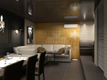 - Поради отразяващите качества на продукта е по -добре да закачите красив фигурен полилей или да инсталирате прожектори в стая с черен таван..
