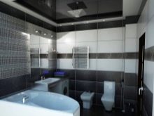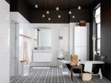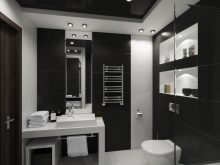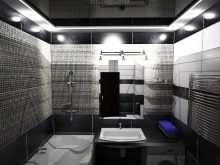- Черният таван в банята може да бъде допълнен с обикновени плочки или мебели.
