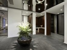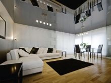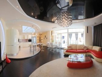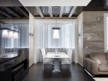 Модерен стил с плавни линии на светли цветове може да бъде допълнен с черен огледален таван и обемен полилей, разположен в центъра на стаята. Тази опция, комбинирана с контрастни елементи на тапицерия и мека мебел, е идеална за студиа, където холът и трапезарията се намират в една и съща стая..