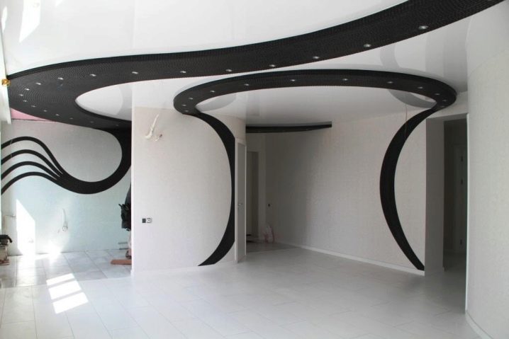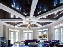 Таванните конструкции на две нива в хола, където черното платно ще действа като един от елементите, също ще бъдат идеално решение за много стаи..