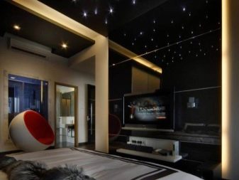 - Първият начин е създавайки лек визуален ефект, което най -често е имитация на нощното небе. Това решение изглежда просто хипнотизиращо, тъй като хората с романтично настроение са склонни да гледат звездите с часове. В някои случаи можете да направите небето статично, като просто инсталирате малки вградени лампи директно в черните недра на тавана, но движещото се „небе“ ще изглежда още по-впечатляващо.