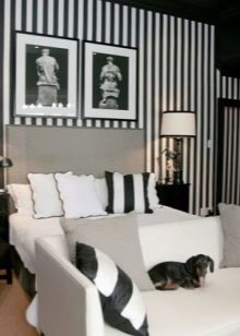- някои дизайнери дори успяват да направят стаята визуално по -висока с помощта на черен таван, за това просто трябва да украсите белите стени с черни вертикални ивици, които плавно се вливат в тъмния таван без очевидни граници;