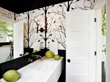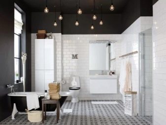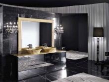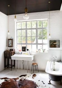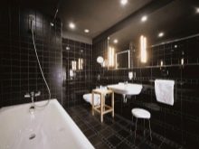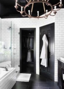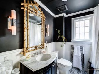 - В банята черният таван е много подходящ, защото има много светли и лъскави елементи, които придават на такава мрачност уникален шик. Често декораторите оставят в бяло само пода и рамката около огледалото, запазвайки всичко останало в подчертани тъмни цветове..