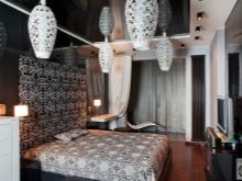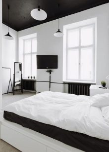 - В спалнята черният таван също изглежда много хармонично, тъй като изобщо не отвлича вниманието от съня. Друго нещо е, че тук не се препоръчва да избирате лъскаво черно покритие, защото спането пред огледало е съмнително удоволствие. Но използването на ефекти като звездното небе ще ви помогне да създадете уникална романтична атмосфера..