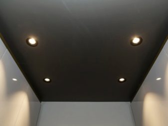 - Вторият начин предполага наличието на източници на светлина, които не са директно свързани с тавана. Това може да бъде както висящ полилей, така и прожектори, монтирани на стените. Смисълът на ефекта е да насочи лъчите светлина към лъскав черен таван, в който те ще бъдат отразени, демонстрирайки играта на отблясъци. Подобни ефекти се забелязват само в относително тъмни помещения и въпреки това има смисъл да се направи избор в полза на такова решение, поне заради романтичната атмосфера в тъмното..