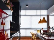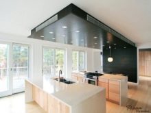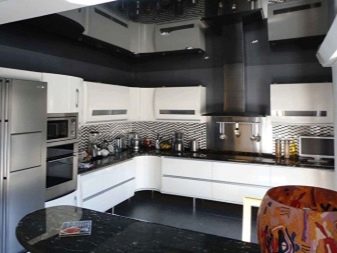 - Кухня с черен таван, той трябва да бъде изключително лаконичен: тук не е необходима изтънченост, както и изобилие от декор или малки детайли. Конструктивният минимализъм за такава кухненска стая ще бъде най -добрият избор, но е по -добре да изберете мебели и уреди в светли цветове, за да придадете на атмосферата на стаята по -тържественост..