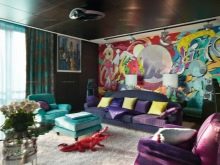 - За хола такова решение е напълно оптимално, тъй като ви позволява да създадете лека атмосфера на клуб. Никой не е тук през целия ден, така че и черният таван, и ярките крещящи акценти на най -неочакваните цветове ще изглеждат подходящи..
