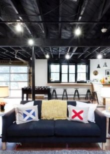 - ако панорамните прозорци в стаята осигуряват голямо количество естествена светлина, то именно черният таван ще даде перфектната рамка на видимите пейзажи;