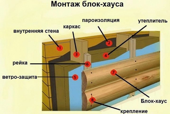 Струва си да се има предвид, че външното довършване на фасадата изисква наличието на такива допълнителни материали като изолация, антисептик, грунд и пароизолационен филм. Преди да облицовате къщата с блокова къща, трябва да инсталирате пароизолация. Работата се извършва с помощта на телбод и телбод, с помощта на които филмът е фиксиран към рамката, образувайки припокриване от 10-15 cm.