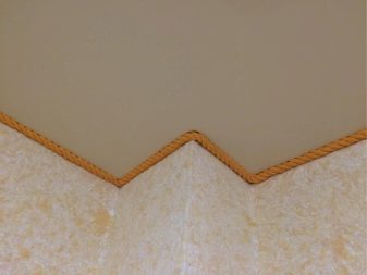 Декоративният шнур в много отношения надминава други видове вложки за опънати тавани. Възможностите за използване на такъв материал за повърхностна декорация са много по -широки. С помощта на декоративна сбруя можете да оформите художествен кант на опънат таван, който ще украси интериора на стаята. В допълнение, продуктът е идеален за многократна употреба. В този случай въжето може безопасно да се почисти или измие..