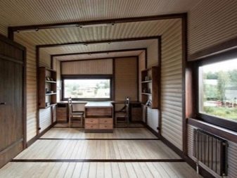Облицовката на шкаф от блок къща ще добави строгост, уважение към него, ще подчертае статута и добрия вкус на неговия собственик. По -добре е да изберете материал с по -тъмен нюанс, съчетавайки го със съвпадащи мебели, естествена кожа, оригинални елементи на дизайна.