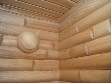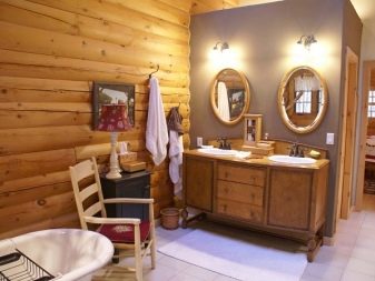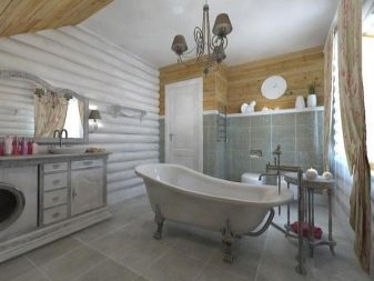 Когато завършвате с блок къща, банята може да се превърне в луксозен будоар. Обикновено и тук се използва светъл материал. Като опция – избелено дърво. За повече аристокрация можете да добавите тъмни „трупи“. Избирайки този вид облицовки, трябва внимателно да третирате дървесината с водоотблъскващи средства..