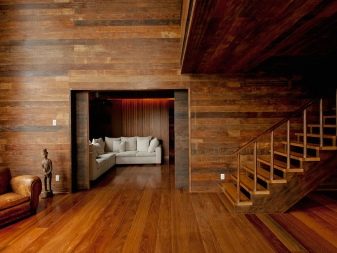 Първите съдържат голямо количество смоли и етерични масла., което осигурява естествен антисептичен ефект. Освен това те внасят в къщата уникалния аромат на иглолистната гора. Обикновено се използва смърч, който има голям брой възли, което създава интересен модел. Борът радва с атрактивен кехлибарено-златен оттенък, стая, украсена с такъв материал, изглежда топла и уютна.