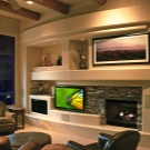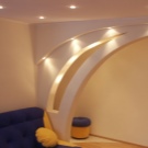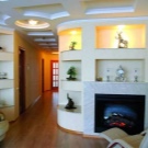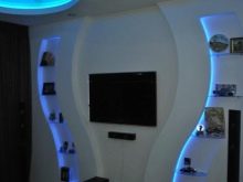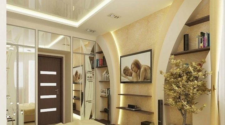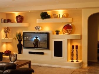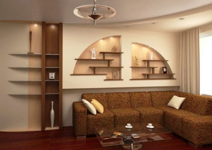 - Композиция от ниша и рафтове от гипсокартон ще ви позволи да поставите всички необходими неща, а точковото осветление, насочено към отделните му части, ще направи стаята уютна, за радост на всички обитатели на къщата.