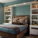 - Приглушена синьо-зелена цветова схема, комбинирана с уютна осветена ниша, създава усещане за топлина и спокойствие.