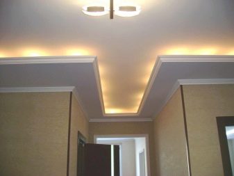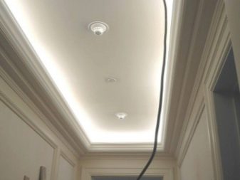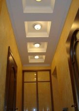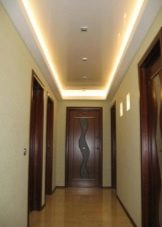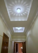 Връщайки се към коридорите и коридорите, трябва да се подчертае, че едноцветните тавани от светли цветове, непрекъснато осветени по периметъра, се проявяват най-добре в тях. Подобни решения помагат да се отървете от ненужния мрак и тежест на тези помещения, които почти винаги са отдалечени от основните прозорци в къщата. Източниците на светлина най -често са точкови или лентови. Изборът на сводове, арки помага да се увеличи привлекателността на финала.