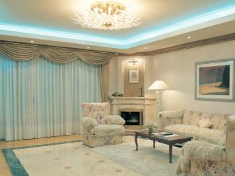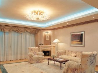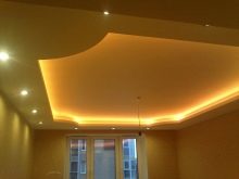 Осветлението за таван на две нива е много важно. Почти винаги те използват LED източници на светлина. Атрактивността им се дължи на мекото и равномерно сияние, способността визуално да увеличава дълбочината на таваните и да създава усещане за „плаване във въздуха“ за наблюдателя. Чрез промяна на интензитета на светлината и цвета на лампите е възможно да се създаде наистина уникална подсветка, която няма да намерите никъде другаде. Можете да увеличите яркостта, като въведете лампи или подови лампи. Разположението на вградените осветителни тела трябва да направи светлината еднаква в цялата стая..