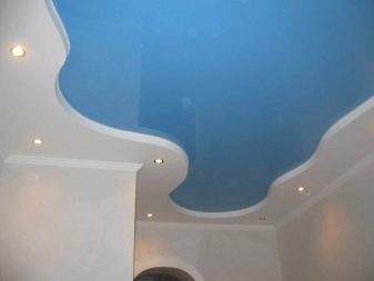 Син таван с централен прожектор и периметърно осветление може да изглежда омайващо и необичайно. За да се подчертае специфичността и привлекателността на такова решение, да се свърже с останалата част от стаята, е препоръчително да се декорират стените в същия диапазон. Един прост бял таван може да бъде разнообразен с дъгообразна лента, повдигната над основната равнина. Препоръчително е да вградите в него източници на светлина. Добрата дизайнерска техника е комбинирана със светли стени, покрити с тапети с вертикални райета..