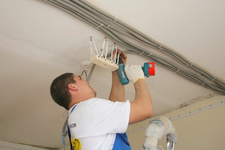Изборът на крепежни елементи е продиктуван от материала, в който те трябва да бъдат включени. Профилът на ключа на компактдиска е фиксиран на стъпки от 600 мм, освен ако няма причина за промяна на това разстояние. Но окачванията не трябва да се носят по -далеч от 0,5 м. Краищата на монтираните окачвания трябва да бъдат огънати, за да се получи форма като буквата П. Електрическото окабеляване е поставено в гофрирана пластмасова тръба. Предполага се също, че трябва да се фиксира старателно, с помощта на щипки..