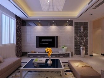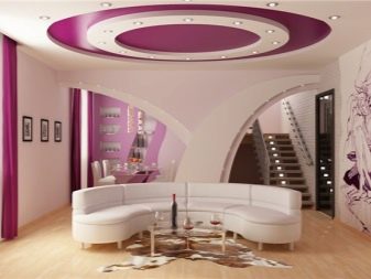 В таванско помещение и селска местност се препоръчва използването на греди. Класическият тип таван на две нива е идеално съвместим със светъл цвят, ясна геометрия. Полилеите с атрактивни форми се използват като осветителни тела. Но хай-тек е много по-добре за такова решение, тъй като ви позволява да използвате строга правоъгълна форма. Металните лампи, боядисани със синя или лилава боя, помагат да се подчертаят чертите на ултрамодерен интериор..