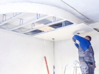 Когато първото и второто ниво са свързани, няма нужда да закрепвате листове от гипсокартон; оставете само квоти от 100-150 мм, за да прикриете грозната рамка. Преди започване на работа е необходимо да се скосят, тоест да се отрежат ръбовете на листовете в ъглите. След това, с последващо довършване, ще бъде по -лесно да се обработи празнината с гипсокартон. Материалът се закрепва, като се започне от ъгъла, листовете не се съединяват твърде плътно, празнина от 0,2 см по целия периметър е напълно приемлива. За да фиксирате правилно винтовете, трябва да направите празнина от 200 мм между тях, като държите центъра и външните ръбове на гипсокартона.